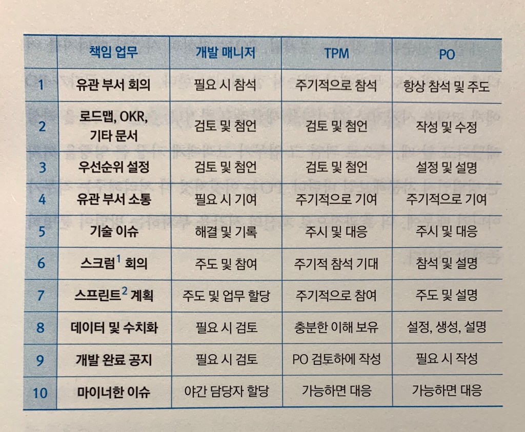 - 개발 매니저, 기술 매니저(TPM, Technical Program Manager)와의 R&R을 명확히 구분한다. (147쪽)