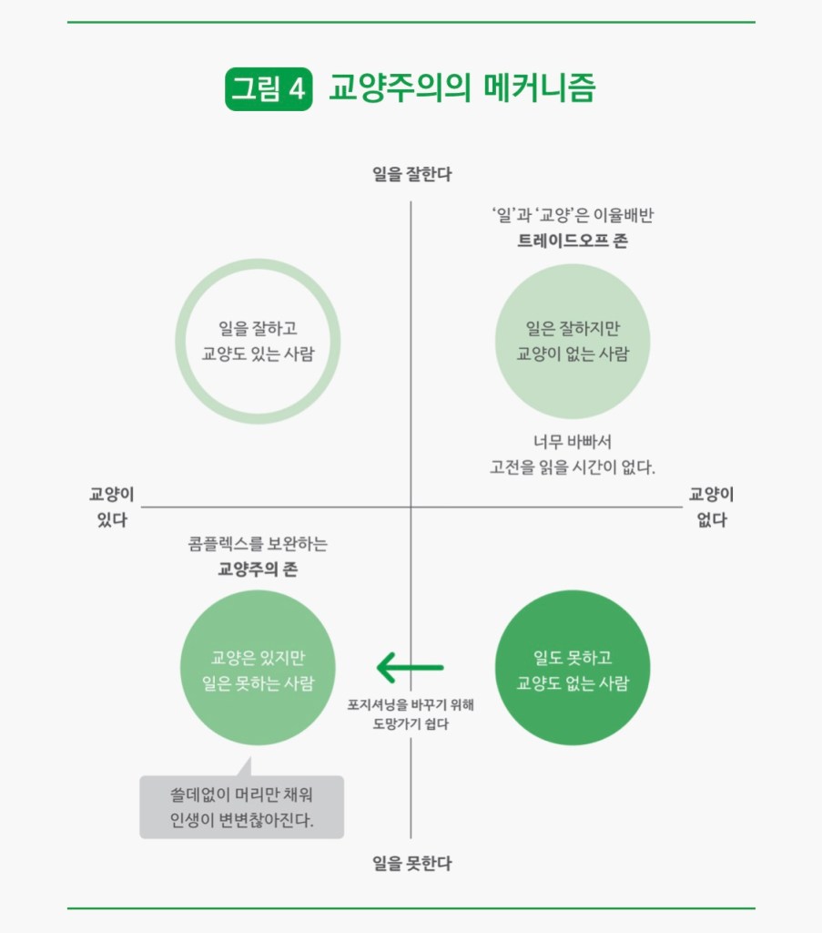 - 교양주의의 함정에 빠지지 않는다(아래 그림4). ‘교양은 있지만 일을 못하는’ 사람을 목표로 삼아서는 안 된다.