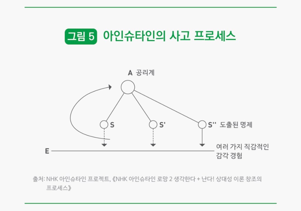 - 아인슈타인의 사고 프로세스(아래 그림5)는 이른바 귀추법(abduction)이라고 부를 수 있는 접근 방법이다.